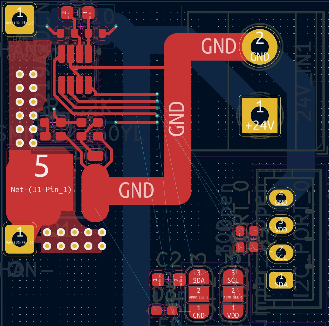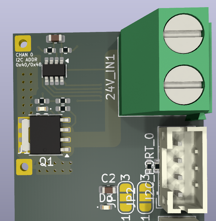 When those eventually arrived I soldered it up and attached it to the downstream USB-C power board that it will be monitoring. 24V goes into the terminal block on the right. I2C for current monitoring and a logic level enable pin go into the 5 pin connector in the bottom right.